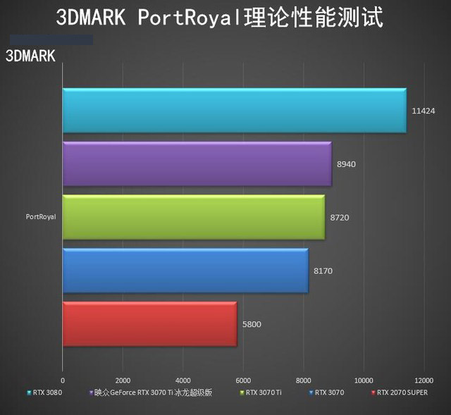 PortRoyal是3DMARK中專門針對(duì)光追性能的測(cè)試項(xiàng),在這組測(cè)試中映眾GeForce RTX 3070 Ti 冰龍超級(jí)版的表現(xiàn)更貼近GeForce RTX 3070,分?jǐn)?shù)提升為9%左右;對(duì)比GeForce RTX 3080的分?jǐn)?shù)差距為27%左右;對(duì)比上一代GeForce RTX 2070 SUPER的分?jǐn)?shù)提升則非常大,約為54%。