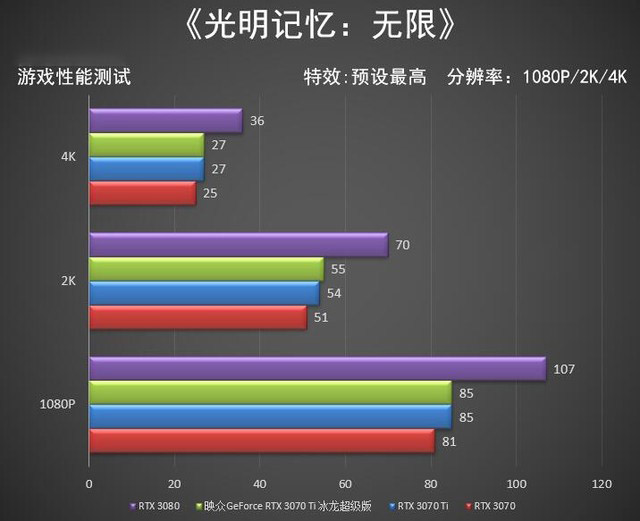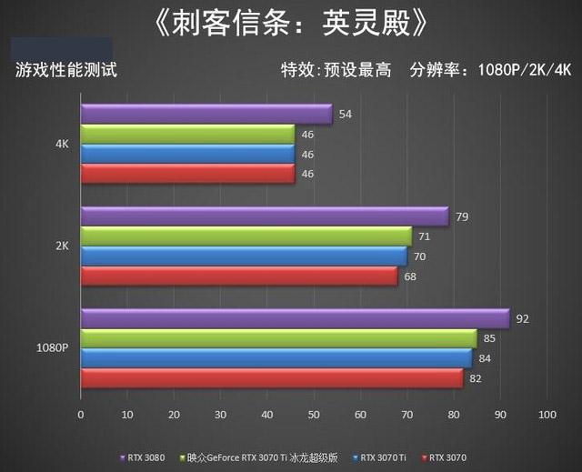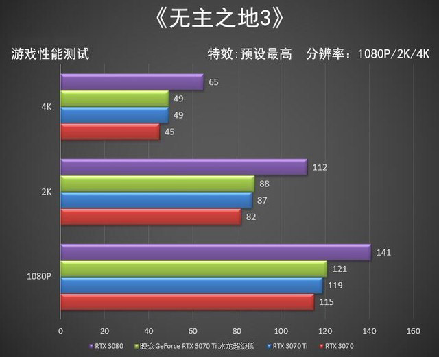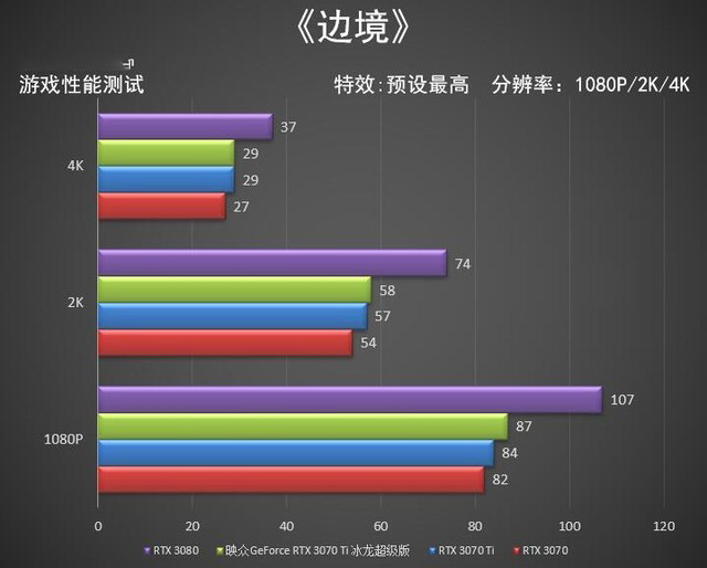 不難發(fā)現(xiàn)在1080P分辨率下三款顯卡差距很小,其實(shí)在低分辨率下CPU已經(jīng)限制了顯卡的發(fā)揮,而在4K分辨率下GeForce RTX 3080能領(lǐng)先映眾GeForce RTX 3070 Ti 冰龍超級(jí)版約22%的幀數(shù)。