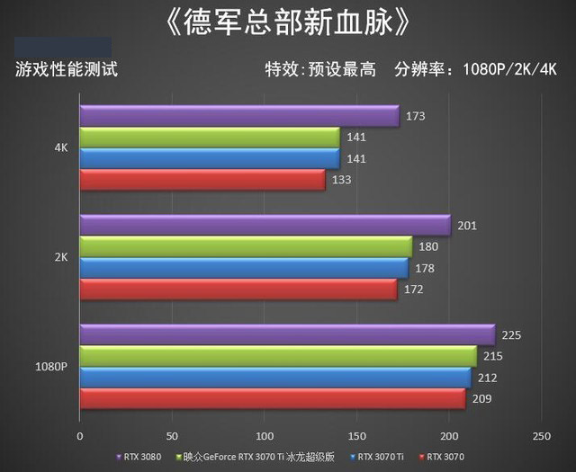 《德軍總部新血脈》并且由于自帶兩個(gè)benchmark,所以我們的數(shù)據(jù)取跑分均值,另外這款游戲幾乎每更新一次驅(qū)動(dòng)或者游戲版本升級(jí)都會(huì)導(dǎo)致分?jǐn)?shù)的巨大差異,在本次重新測(cè)試中,映眾GeForce RTX 3070 Ti 冰龍超級(jí)版與GeForce RTX 3070的差距約為4%,而相比GeForce RTX 3080的幀數(shù)差距為12%左右。