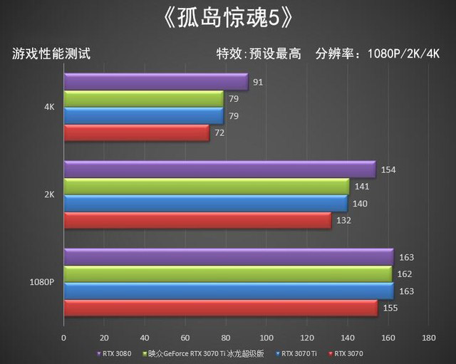 《孤島驚魂5》同樣算是優(yōu)化比較到位的3A大作,在這款游戲中CPU的瓶頸更加明顯,1080P分辨率下兩款顯卡的成績(jī)幾乎相同,在2K和4K分辨率下比較能反應(yīng)真實(shí)水平。
