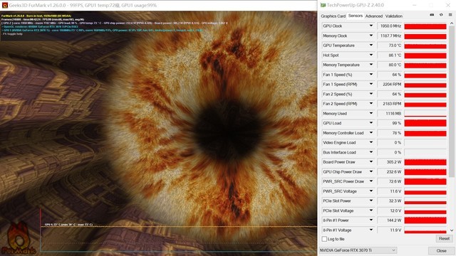 功耗測(cè)試中,我們選擇FurMark軟件進(jìn)行拷機(jī)測(cè)試,并采用GPU-Z檢測(cè)溫度,功耗僅計(jì)算顯卡自身。