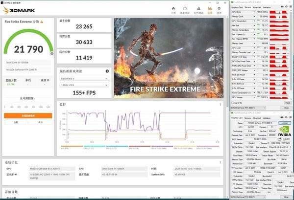 在2K分辨率3DMark Fire Strike Extreme測(cè)試中,iGame RTX 3080 Ti Advanced OC圖形分?jǐn)?shù)達(dá)到了23265分,核心溫度最高71℃,核心運(yùn)行最高頻率為2010Hz,最高風(fēng)扇轉(zhuǎn)速1934RPM,最高功耗372W。