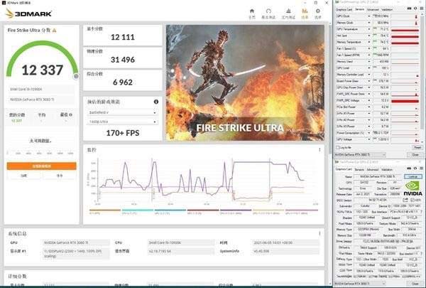 在4K分辨率3DMark Fire Strike Ultra測(cè)試中,iGame RTX 3080 Ti Advanced OC圖形分?jǐn)?shù)達(dá)到了12111分,核心溫度最高71℃,核心運(yùn)行最高頻率為2010MHz,最高風(fēng)扇轉(zhuǎn)速1960RPM,最高功耗370W。
