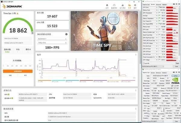 在2K分辨率3DMark Time Spy測(cè)試中,iGame RTX 3080 Ti Advanced OC圖形分?jǐn)?shù)達(dá)到了19607分,核心溫度最高73℃,核心運(yùn)行最高頻率為1980MHz,最高風(fēng)扇轉(zhuǎn)速2071RPM,最高功耗375W。