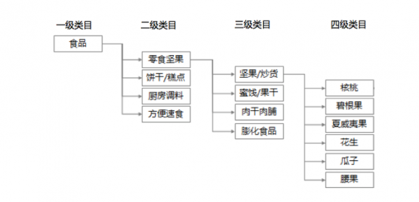 比如下圖中的四級(jí)類目核桃、碧根果等就是葉子類目。電商平臺(tái)的所有商品都是掛在這種葉子類目上。