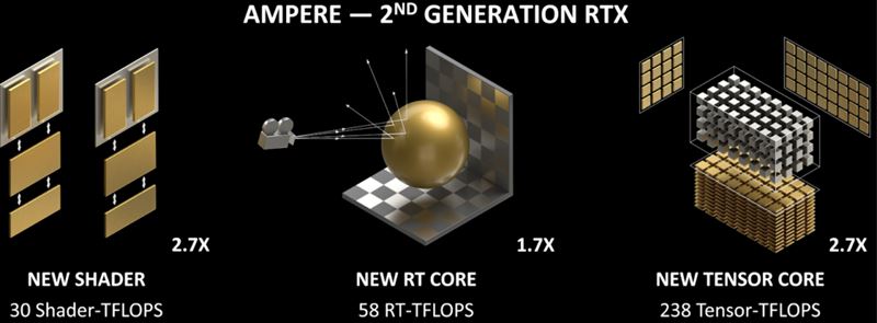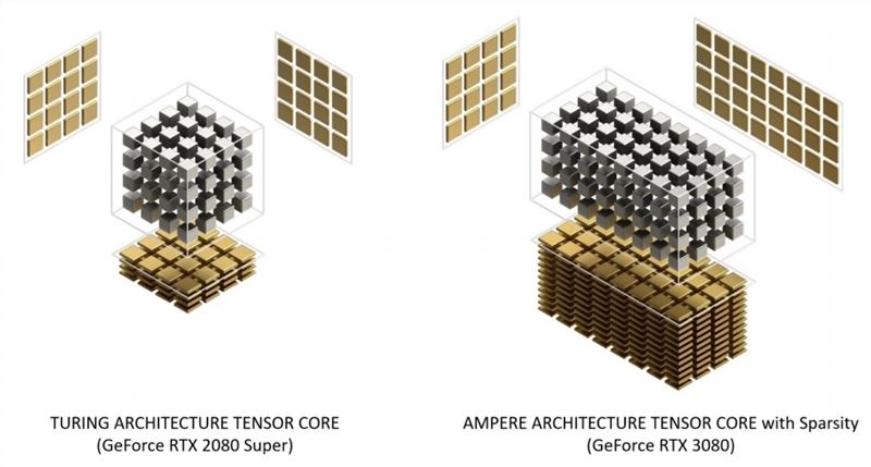 在圖靈架構(gòu)里,NVIDIA 引入了第二代 Tensor Core,而到了RTX 30系列所采用的Ampere架構(gòu),則進化到了第三代Tensor Core。