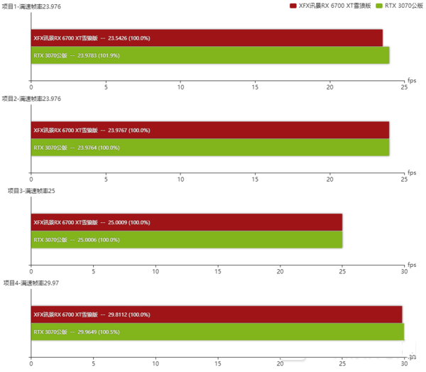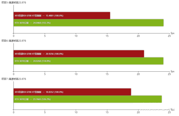 而項(xiàng)目5到項(xiàng)目7這幾個(gè)項(xiàng)目是6K和8K的項(xiàng)目,這里兩款GPU的差距就明顯可以體現(xiàn)出來(lái),RTX 3070領(lǐng)先RX 6700 XT的速度還是不少的,不同的項(xiàng)目領(lǐng)先程度不一樣。并且即使是RTX 3070回放相對(duì)最差的一個(gè)項(xiàng)目——項(xiàng)目7,RTX 3070也能非常接近原始的滿速幀率進(jìn)行回放,掉幀非常的少,這個(gè)項(xiàng)目是一個(gè)8K的項(xiàng)目,可以認(rèn)為RTX 3070基本可以滿足8K回放的需求。
