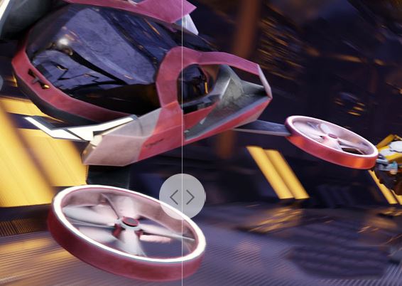 通過(guò)對(duì)比最終渲染導(dǎo)出來(lái)的4K渲染圖可以看到,采用后處理的動(dòng)態(tài)模糊更像是簡(jiǎn)單地加上一些模糊濾鏡,各處都很生硬和不自然,但在光追加速處理過(guò)的模糊效果就要明顯好很多了,應(yīng)該產(chǎn)生模糊的地方都做到,而最明顯的就是無(wú)人機(jī)螺旋槳高速轉(zhuǎn)動(dòng)產(chǎn)生的殘影,這更接近真實(shí)人眼看到的效果,在這種運(yùn)動(dòng)場(chǎng)景有精準(zhǔn)的動(dòng)態(tài)模糊,整體呈現(xiàn)出更強(qiáng)烈的沖擊力。