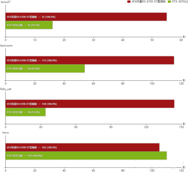 不管是官方的benchmark還是項(xiàng)目實(shí)測(cè),RTX 3070相比RX 6700 XT都領(lǐng)先非常大,僅在benchmark的koro項(xiàng)目中,RX 6700 XT呈現(xiàn)出RTX 3070稍微領(lǐng)先的情況,但是差距也非常近。通過(guò)大量不同的項(xiàng)目測(cè)試,可以認(rèn)為RTX 3070相比RX 6700 XT至少可以為創(chuàng)作者節(jié)省一半以上的時(shí)間,極大的提升效率。