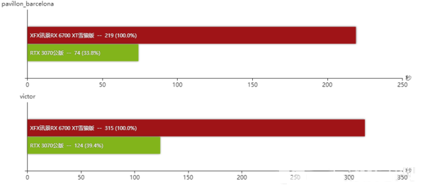 RX 6700 XT和RTX 3070都是非常好的游戲GPU,通過(guò)我們以前的測(cè)試可以知道它們面對(duì)游戲的時(shí)候都能提供非常不錯(cuò)的幀率和畫質(zhì)表現(xiàn),不過(guò)來(lái)到創(chuàng)作類軟件應(yīng)用上面,還是可以明顯看到RTX 3070是具有絕對(duì)領(lǐng)先的優(yōu)勢(shì)的。
