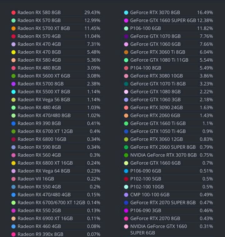 A卡的話580是絕對(duì)不能碰的,其余的還有5700同樣是礦場(chǎng)老板首選??梢哉f除了個(gè)別老型號(hào)以及產(chǎn)量低的新型號(hào),基本已經(jīng)是全員礦卡了。下圖就是目前市面上礦卡的主要占有率分布了,小伙伴們可以進(jìn)行參考。