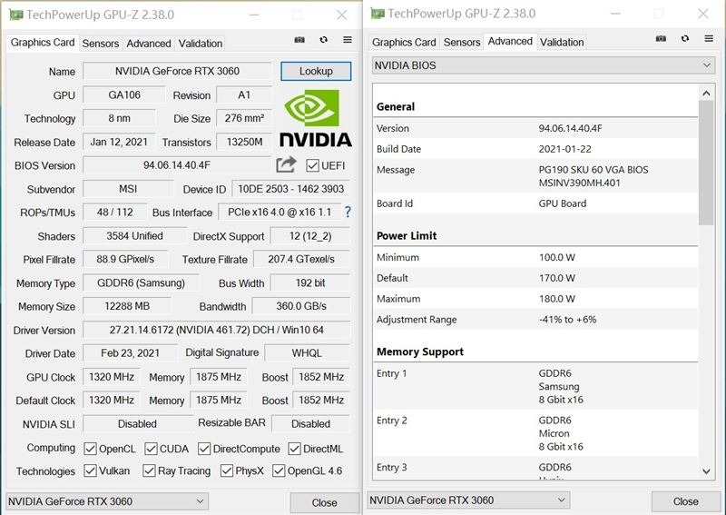以上為GPU-Z的截圖。RTX 3060魔龍擁有3584個流處理器,48個ROP單元和112個紋理單元,顯存容量12GB,顯存頻率15GHz,帶寬360GB/s,以上這些與公版都毫無二致。