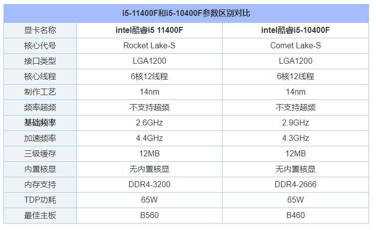 老規(guī)矩,我們先來了解一下intel酷睿i5 11400F和intel酷睿i5 10400F參數(shù)對比情況,初步來了解一下兩款CPU的差異。