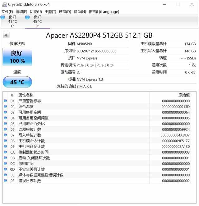 通過(guò)CrystalDiskInfo,我們可以看到關(guān)于宇瞻AS2280P4的相關(guān)參數(shù)細(xì)節(jié),主機(jī)通電次數(shù),支持的相關(guān)協(xié)議功能,普通用戶在購(gòu)買產(chǎn)品的時(shí)候,也可以通過(guò)此軟件簡(jiǎn)單驗(yàn)證產(chǎn)品新舊程度和相關(guān)協(xié)議標(biāo)準(zhǔn)。