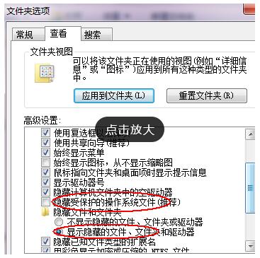 2、在文件夾選項里,選擇查看標簽卡找到顯示系統(tǒng)文件和顯示隱藏文件的選項顯示所有文件;
