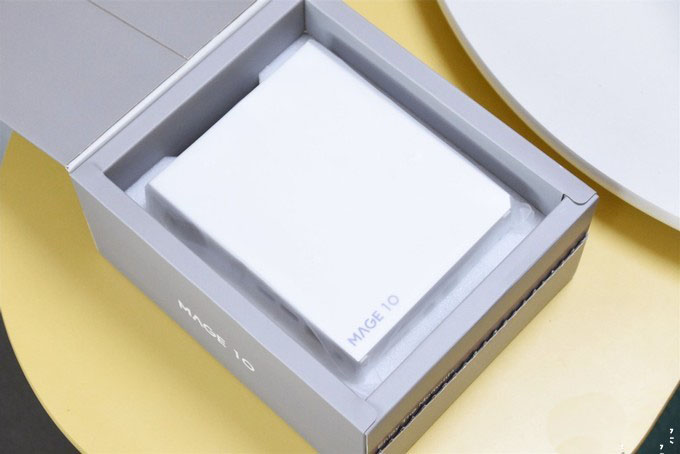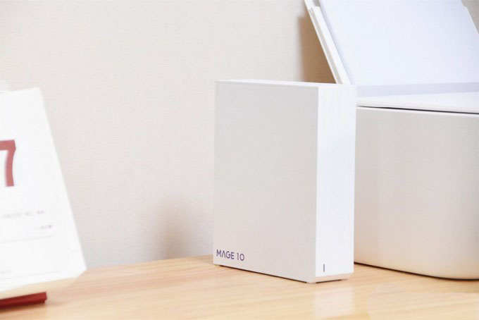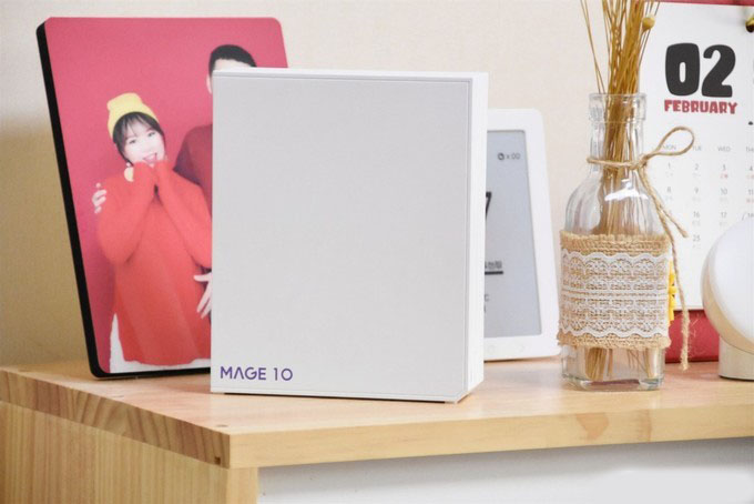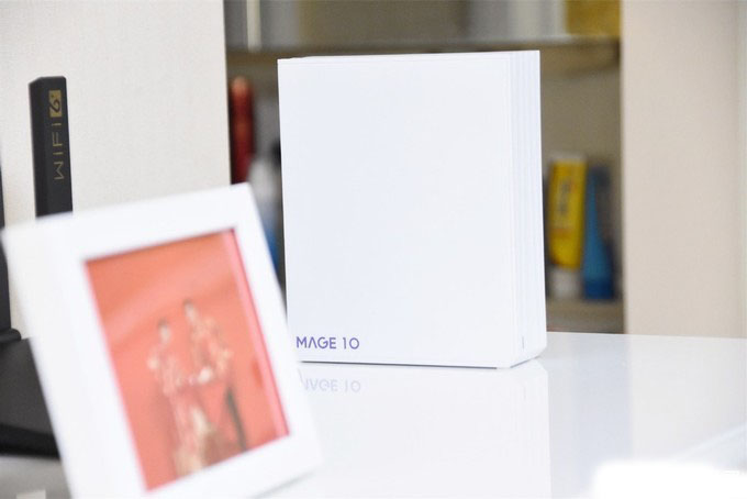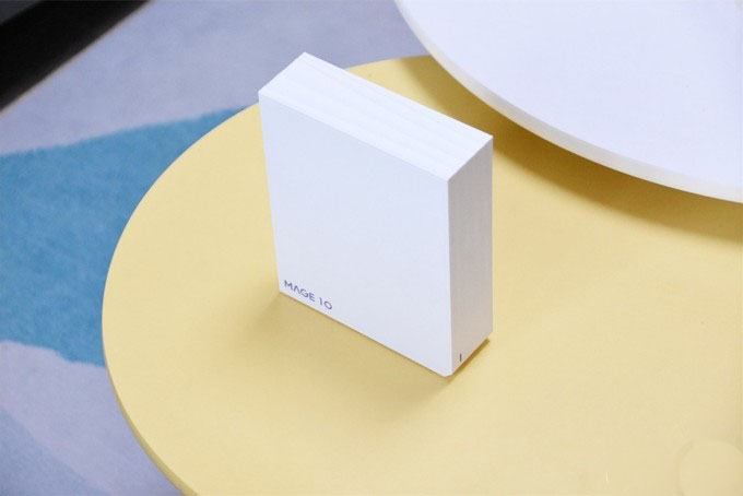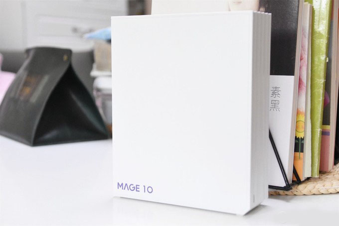 外觀方面,??荡鎯?chǔ)MAGE 10整體上是個(gè)長(zhǎng)方體,確切地說是一個(gè)白色很規(guī)整的長(zhǎng)方體,大小和一本漢英字典相當(dāng),頂部和側(cè)面的延展處由不規(guī)則的條紋覆蓋,在側(cè)面印有MAGE 10的字樣,整機(jī)以白色和紫色為主色調(diào),從包裝風(fēng)格上就能看到。