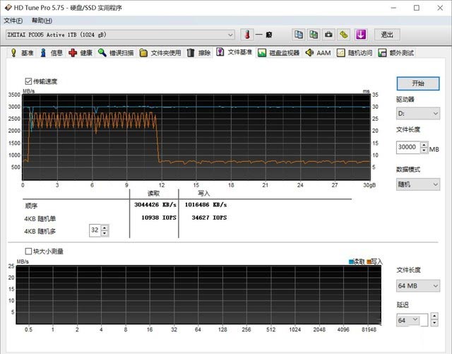 通過CrystalDiskMark/ATTO/Txbench三個軟件的交叉測試,我們可以看到,PC005 Active 1TB版本的最大連續(xù)讀取速度,基本能夠達到3500MB/S的標稱水準,至于最大連續(xù)寫入速度則能維持在2900MB/S左右;相較于512GB版本,在絕對數(shù)值上,有著一定的提升,這也比較符合存儲產(chǎn)品容量越大,性能相對越強的基本規(guī)律。