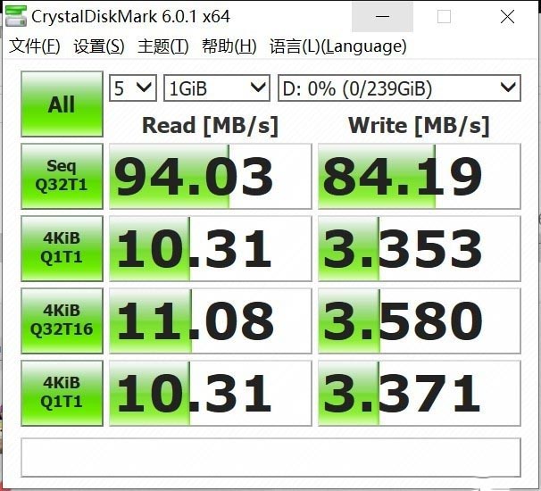 通過Crystal Disk Mark測試成績我們可以看到,三星SD卡PRO Plus的讀取速度讀為94.03MB/s,寫入速度為84.19MB/s。