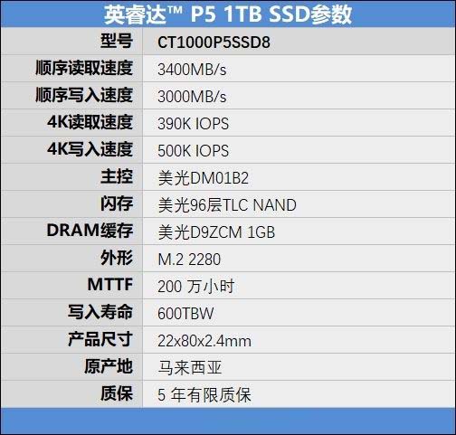 我們快科技收到的是英睿達(dá)P5 1TB SSD,其詳細(xì)規(guī)格如下: