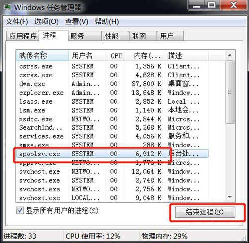 3、在進程列表找到【spoolsv.exe】,點擊【結(jié)束進程】