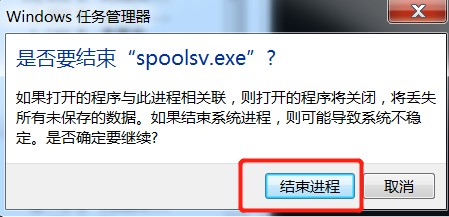 4、彈出是否要結(jié)束【spoolsv.exe】的提示,點擊【結(jié)束進程】