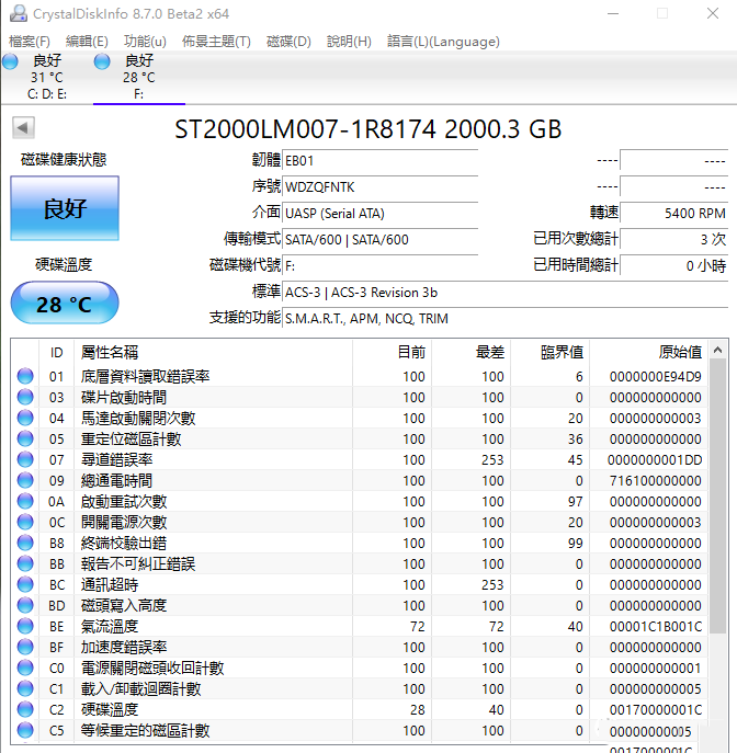 通過CrystalDiskinfo的測試,可以看到內(nèi)置硬盤使用的是大廠希捷的盤作為內(nèi)盤,通電次數(shù)和時間都在合理范圍內(nèi),算是比較良心的。(ps:現(xiàn)在移動硬盤都是疊瓦盤,這個真沒必要糾結(jié)了,阻擋不了大勢所趨,疊瓦也不是不能用)
