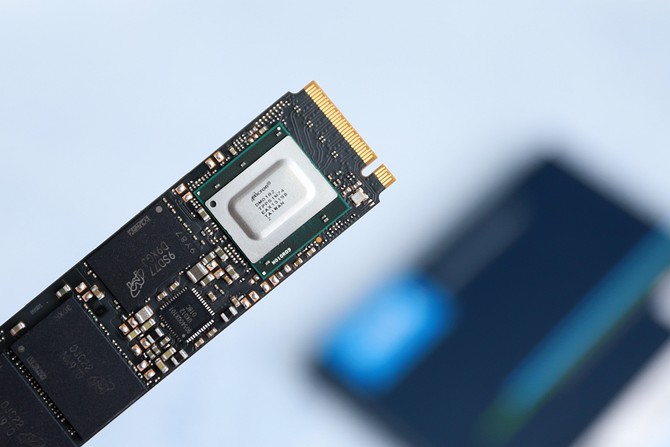 揭開標貼,下面是美光自研的3D NAND控制器和閃存顆粒,并配備了獨立緩存。