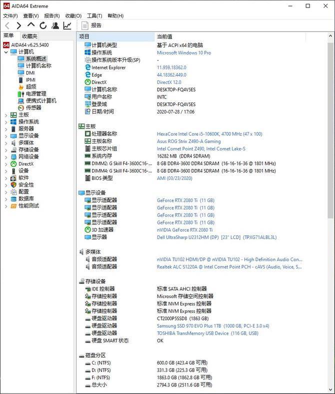 此次測試的平臺,主板是ROG Strix Z490-A Gaming,支持雙M.2 PCIe 3.0×4接口,并帶有散熱片。英特爾十代酷睿i5-10600K處理器,RTX2080Ti獨顯,16GB DDR4-3600MHz雙通道內存。