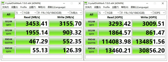 首先使用CrystaDiskMark來檢測一下這款固態(tài)硬盤的讀寫速度,順序讀取速度為3453.41MB/s,順序寫入速度為3155.70MB/s,隨機4K讀取速度11K IOPS,寫入13K IOPS,均超過標稱速度,說明其還是比較保守的。