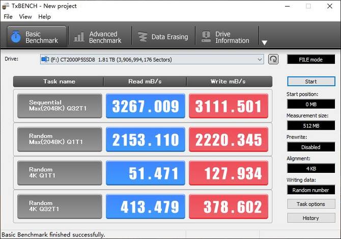 使用TxBENCH進行基準速度測試,順序讀取3267MB/s,順序寫入3111MB/s,同樣高于標稱的速度,看來其性能也是非常穩(wěn)定的。