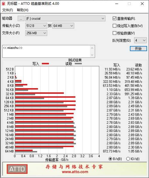 ATTO也是常用的磁盤讀寫速度檢測工具,該軟件使用不同大小的數據進行測試。測試完成后,數據以直方圖的形式呈現讀取和寫入,顯示了不同文件大小比率對磁盤速度的影響。最終的檢測結果,最大讀取速度為2.89GB/s,最大寫入速度2.89GB/s,曲線相對平穩(wěn),僅在初始和結束時變動較大。