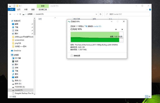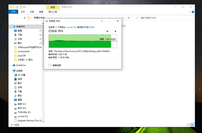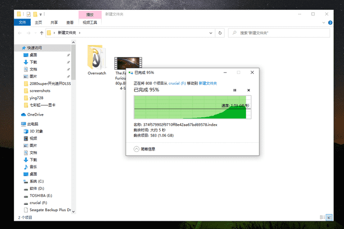 多個基準測試之后,可以看到這款英睿達P5固態(tài)硬盤在性能上的表現相當不錯,接下來我們再用實際拷貝的方式來進一步驗證。首先我們選擇一個1080P電影,文件大小約9.8GB,單個文件的讀寫速度會更快,在P5上的讀寫都是數秒就完成了,毫無壓力。