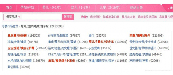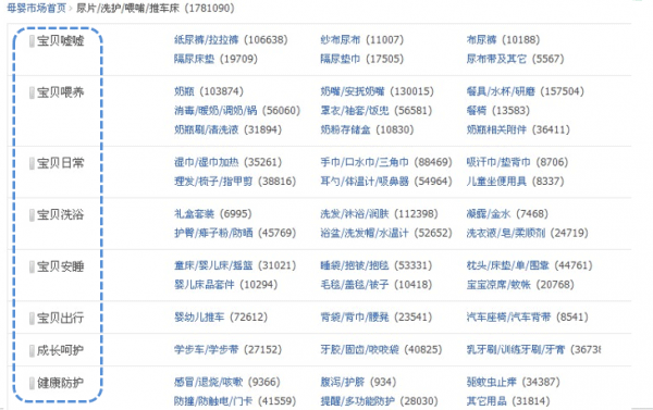 某平臺母嬰市場頻道頁的前臺類目,雖然采用標(biāo)紅的類目突出重點(diǎn),我們?nèi)匀豢煽闯鲞@種展示方法相當(dāng)混亂,顧客查找效率很低。