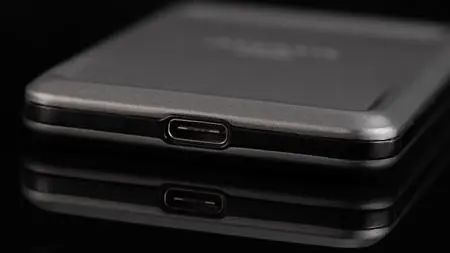 從側(cè)面看過去威剛SC685P移動SSD就是一個三明治結(jié)構(gòu),正面和背面兩層材質(zhì)同為金屬材料,中框采用亮黑色的拋光面塑料作為銜接。這款移動SSD采用USB 3.2 Gen 2 Type-C接口,接口帶寬能到1000MB/s,遠(yuǎn)超它內(nèi)部SATA SSD的速度,而且用的Type-C接口可正反插,不會再發(fā)生USB口懟不進(jìn)去反過來再試一次的蠢事。
