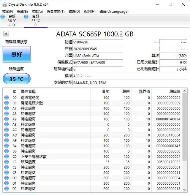 威剛SC685P 1TB的CDI截圖,從軟件識別可只它里面是一只SATA 6Gbps的SSD,官方文檔顯示用的是TLC閃存