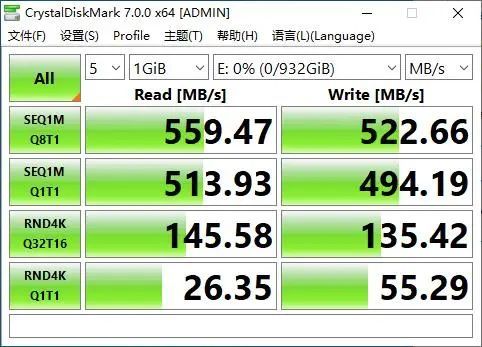 用CDM測出來這個移動SSD的連續(xù)讀取速度為559MB/s,而連續(xù)寫入速度則為523MB/s,很標(biāo)準(zhǔn)的SATA SSD, 因?yàn)镾ATA 6Gbps接口的速度遠(yuǎn)沒有USB 3.2 Gen.2接口的極限,所以瓶頸基本上都在SSD內(nèi)部的SATA口那里,4K QD1隨機(jī)讀取速度為26MB/s,隨機(jī)寫入速度為55MB/s,可以判斷它應(yīng)該是沒有外置DRAM緩存的,不過移動存儲設(shè)備的隨機(jī)性能并沒有內(nèi)置存儲設(shè)備那么重要,因?yàn)榇鎯Φ幕旧隙际沁B續(xù)的大文件,零碎的東西相對沒內(nèi)置SSD那么多,這樣的成績其實(shí)也夠用了。