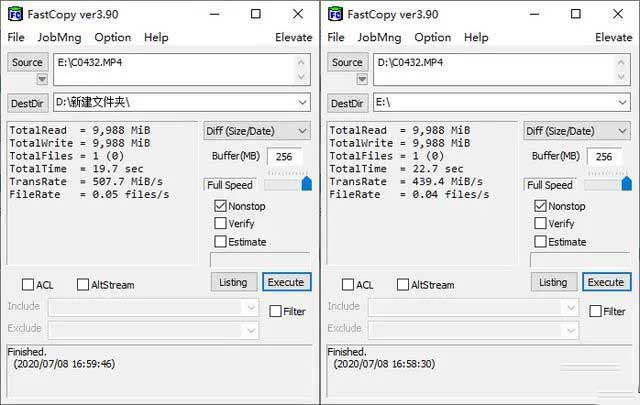 用Fastcopy軟件寫入和讀取一個大型媒體文件,這是個9.75GB的MP4文件,目標(biāo)盤就是系統(tǒng)盤的技嘉 AORUS NVMe Gen4 SSD 2TB,所以目標(biāo)盤比這個移動SSD快多了,所以不存在任何的讀寫瓶頸,從移動SSD讀取這個視頻文件耗時19.7秒,平均讀取速度為507.7MB/s,而把這個文件寫入到移動SSD里面耗時22.7秒,平均寫入速度439.4MB/s,速度相當(dāng)之快。