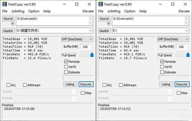 我們繼續(xù)使用用Fastcopy軟件寫入和讀取一個《守望先鋒》的游戲文件夾,總大小為19.4GB,共914個文件,讀取這個文件夾耗時40.5秒,讀取速度492MB/s,寫入則耗時46.4秒,寫入速度429.1MB/s,速度也是相當(dāng)之快的。