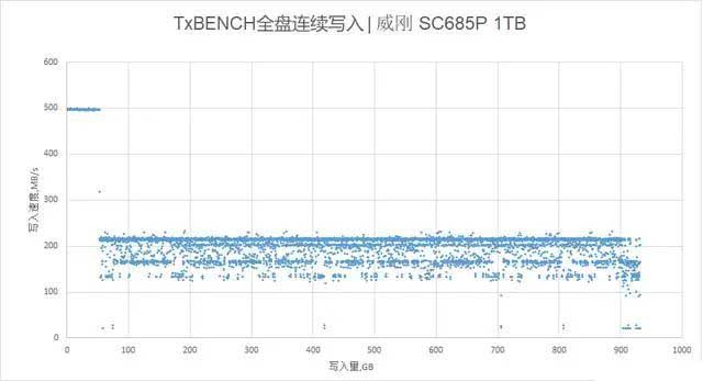 我們用TxBENCH的全盤寫入測試來檢測這款SSD的SLC Cache大小,它的SLC Cache空間是52GB,在SSD有SLC Cache的時候?qū)懭胨俣却蟾庞?90MB/s以上,但當(dāng)緩存用光之后速度會在130MB/s到210MB/s之間波動,波動范圍正常,總體來說SLC Cache夠用,而且Cache外速度還行。