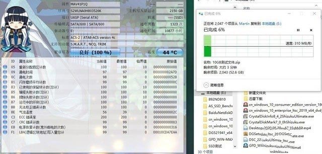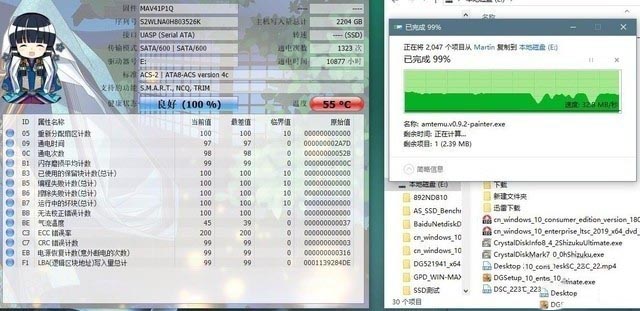 為了進一步驗證,溫度對于性能的影響,筆者樸素的做了個對比監(jiān)測實驗,即連續(xù)不斷的向移動固態(tài)硬盤中拷貝數(shù)據(jù),同時利用CrystalDiskInfo進行溫度監(jiān)測,最終隨著拷貝數(shù)據(jù)量的不斷加大,移動固態(tài)主控溫度不斷上升,實際的傳輸性能也呈現(xiàn)著較為規(guī)律的性能下降。