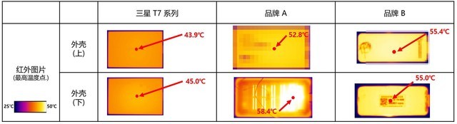 根據(jù)實驗室測算,應用了ePCM材料的三星T7,能夠實現(xiàn)最高性能運行情況下,產品表面最高溫度不超過45℃,遠低于其他品牌10°C以上。