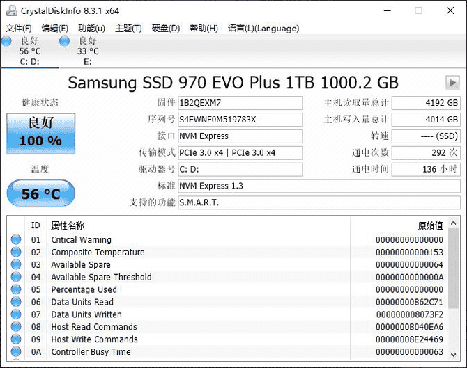 CrystalDiskInfo是一款著名的硬盤信息檢測工具,可以看到三星970 EVO PLUS支持NVMe 1.3標(biāo)準(zhǔn),使用了PCIe 3.0協(xié)議。