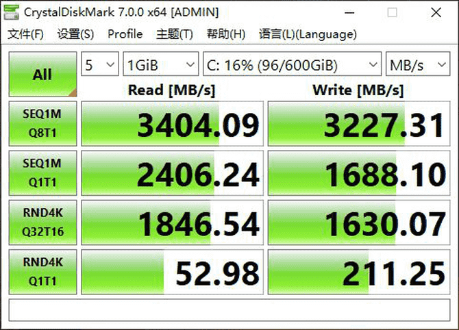CrystalDiskMark是一款高知名度硬盤速度測試軟件,三星970 EVO PLUS的讀取成績?yōu)?404.09MB/S,寫入成績?yōu)?227.31MB/S,基本達(dá)到了官方宣傳的賬面水準(zhǔn),性能表現(xiàn)非常優(yōu)異。相比采用SATA接口的固態(tài)硬盤要快上很多,對比另一款市售M.2接口NVMe協(xié)議的固態(tài)硬盤也有一定優(yōu)勢。