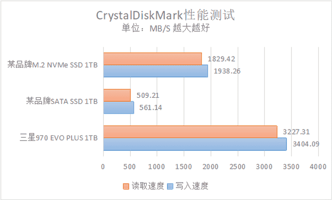 (此次測試我們選用的對比產(chǎn)品為市售主流的兩款固態(tài)硬盤,一個為SATA接口,另一個則是M.2接口NVMe協(xié)議,容量均為1TB版本)