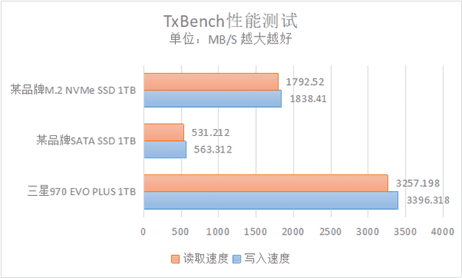 另一項(xiàng)測試TxBench中,三星970 EVO PLUS的順序讀取速度達(dá)到了3396.318MB/s、順序?qū)懭胱畲笾禐?257.198MB/s,對比競品同樣有著較大的性能優(yōu)勢。