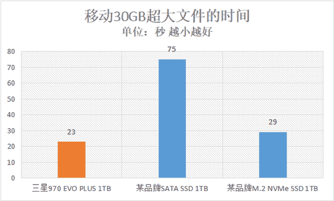 可以看到,在實(shí)際的復(fù)制大文件應(yīng)用場景中,三星970EVO PLUS 1TB所花費(fèi)的時(shí)間是最少的。
