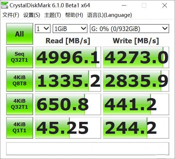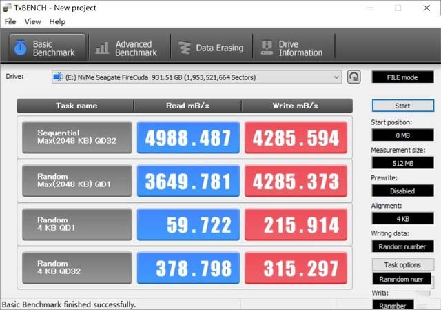 通過上圖我們可以看到,在TxBENCH測(cè)試中表現(xiàn)同樣優(yōu)秀。最大讀取速度為4988MB/s,最大寫入速度為4285MB/s,依舊十分穩(wěn)定。