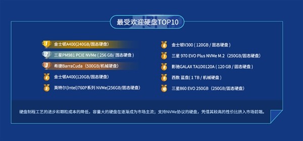 最受歡迎的十款硬盤中,大容量、NVMe也成為流行趨勢。拔得頭籌的是高性價(jià)比的金士頓A400 240GB,類似的A400 120GB、V300 120GB也都上榜。