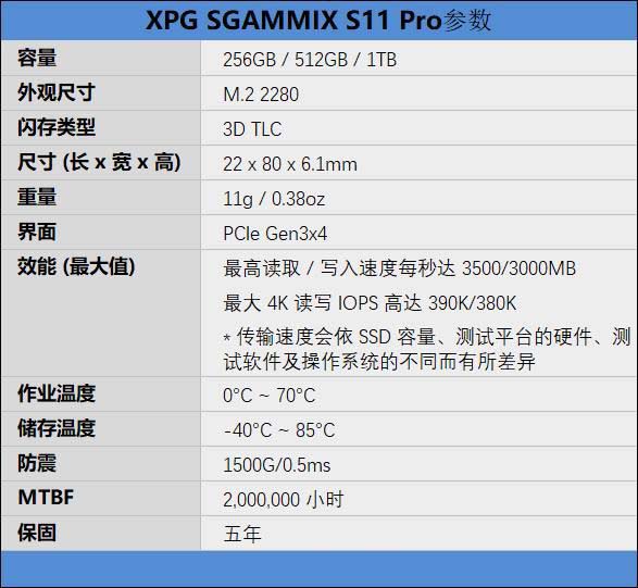 威剛XPG GAMMIX S11 Pro參數(shù)如下:
