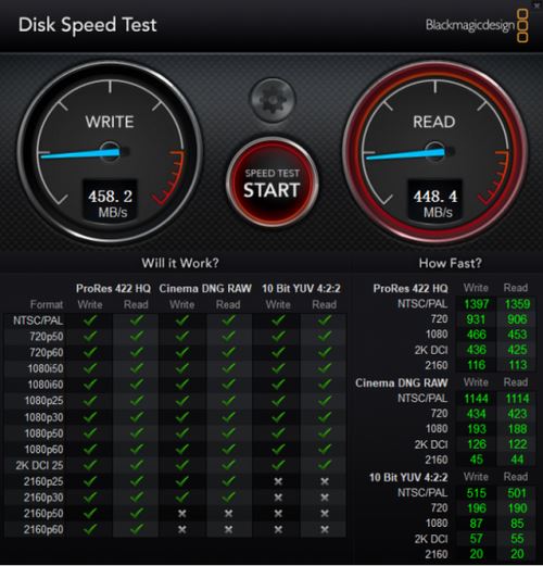 根據(jù)Disk Speed Test的測試來看,其寫入速度為458.2MB/s,讀取速度為448.4MB/s,與官方給出的數(shù)據(jù)存在小小差距,不過屬于正常范圍。